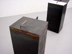 | 1.SALT BOOK - Right Hand 2001 steel, salt, wood, cloth 78 x 41 cm 2. SALT BOOK - Putting Left Hand on My Carotid Artery 2001 steel, salt, glass, drawing (ink on paper) 78 x 41 cm 3. SALT BOOK - Salt Edge 2001 steel, salt, heat 78 x 41 cm 4. SALT BOOK - Salt Hole 2001 steel, salt, hair 78 x41 cm 5. SALT BOOK - A Breathing 2001 steel, salt, resin, beath 78 x41 cm 6. Storage - The Ecology of Flies and Their Momenta 2001 steel, maggots, acrylic, ceramic, tiles 33 x31 x31 cm ed=5 |